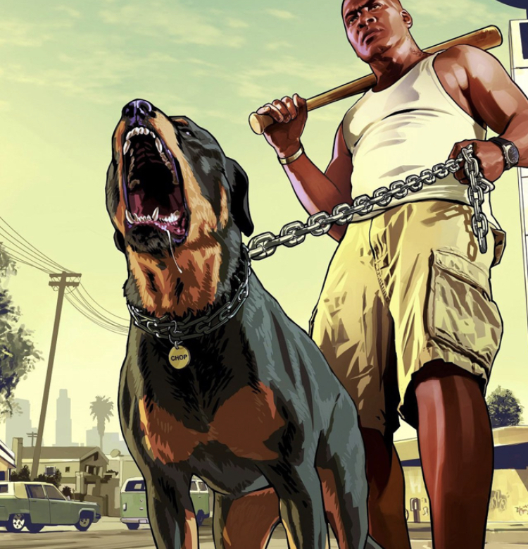 Franklin And Chop Is A Piece Of Promotional Artwork For Grand Theft Auto V (Gta 5) Depicting The Character Franklin Holding His Rottweiler Dog Chop On A Chain Leash.